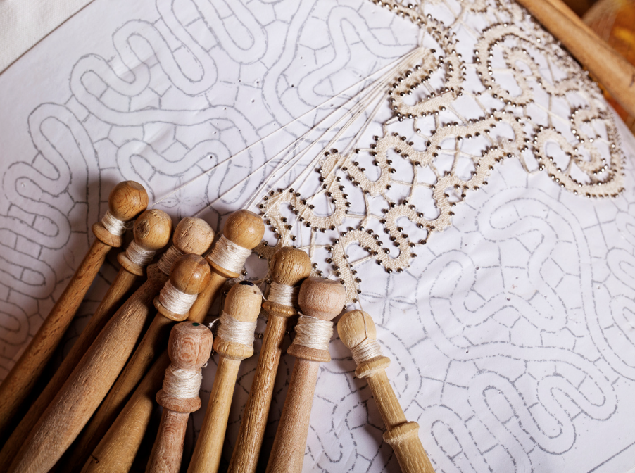 Bobbin Lace – Braiding and twisting threads wound on bobbins to create lace patterns.