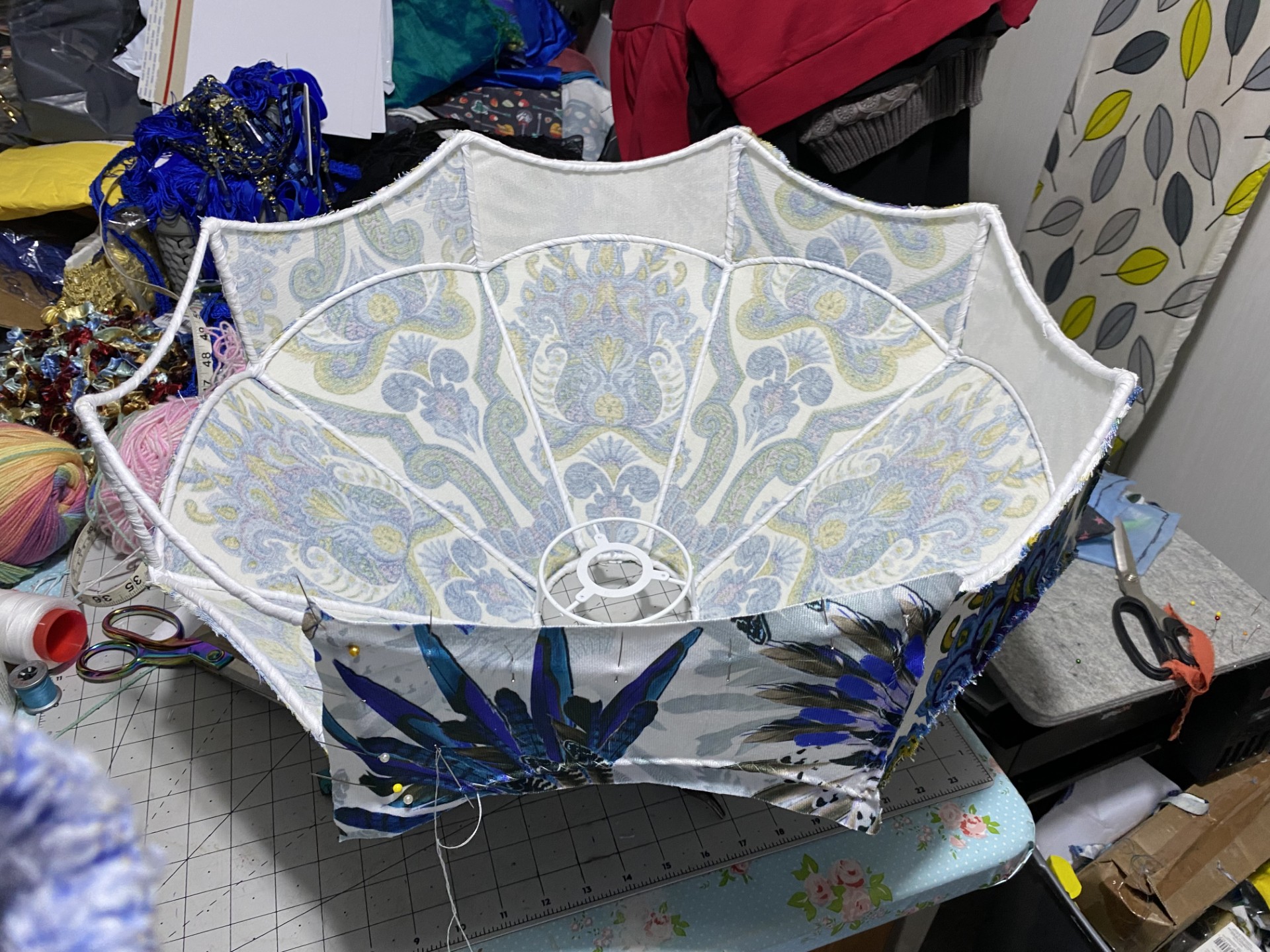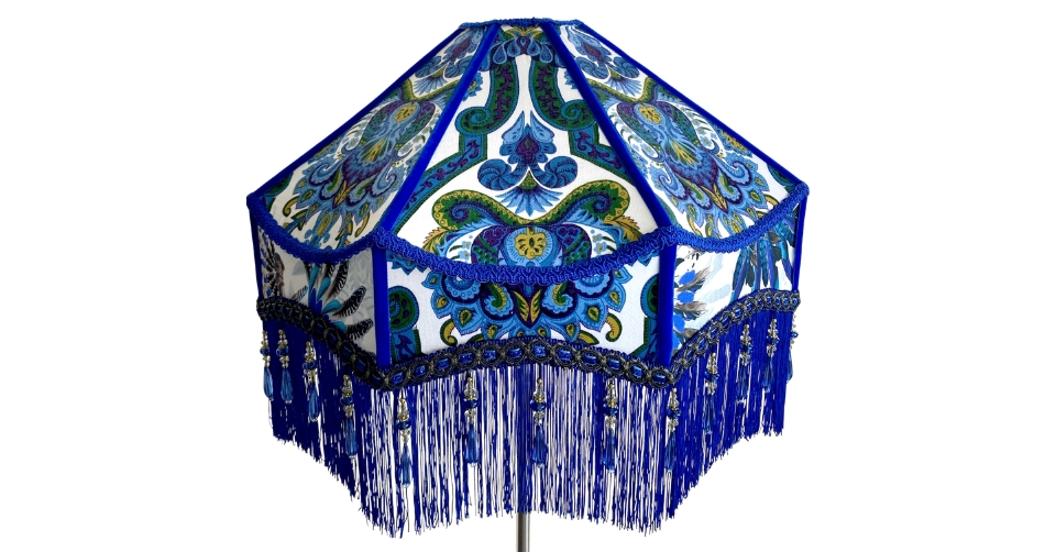 Vintage curtains, upholstery fabrics or medium-weight furnishing fabrics all work well. Prints with strong colours or bold motifs are ideal, especially if you’re aiming for that loud, eclectic maximalist look. You could also mount delicate fabrics over a studier base cloth, using layering as a design feature. Choose a wire frame that suits the intended lamp. Make sure the shade fitting is compatible with your UK light pendant before purchasing. Larger frames, such as the 22-inch shade pictured below, work well on tall floor lamps and create a strong visual statement.