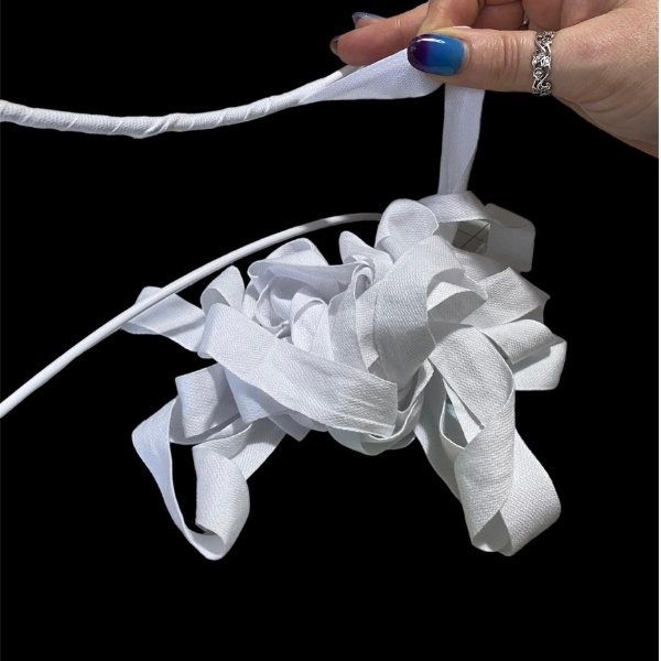 Before attaching any fabric, the wire frame must be wrapped in woven cotton tape. This creates a surface that can be stitched into when mounting the panels.